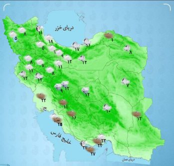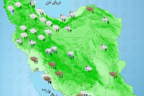 بارش باران و کاهش دمای هوا در شمال کشوردر شمال غرب، برخی مناطق غرب، استانهای ساحلی دریای خزر، بخشهایی از مرکز، شرق، جنوب شرق، استانهای